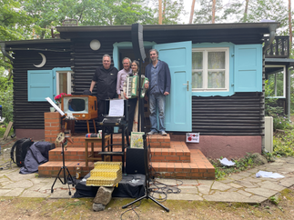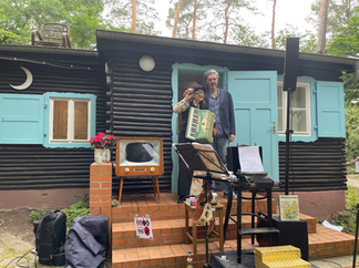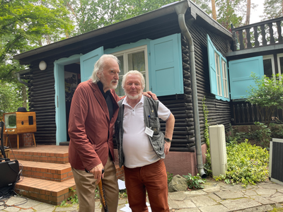 (auf dem Foto: Berlershaut in der Sommerhaus-Residenz von John Heartfield, dem Berlershaut wegen seiner Fotomontagen und seiner Cover-Gestaltung eine hohe Ehre zollt, weil auch er aktuell mit Collagen und Fotomontagen arbeitet und sie veröffentlicht.)